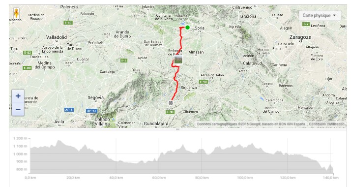 Et même à 15h30 le soleil tape encore très fort, heureusement qu’il y avait un bon vent pour rafraîchir sauf qu’il était de face… J’ai quand même réussi à rallier Jadraque et son château qui me rappellent un peu la Turquie. Et regarder Bayern / Barça dans le resto du coin avec les Espagnols ça n’a pas de prix!